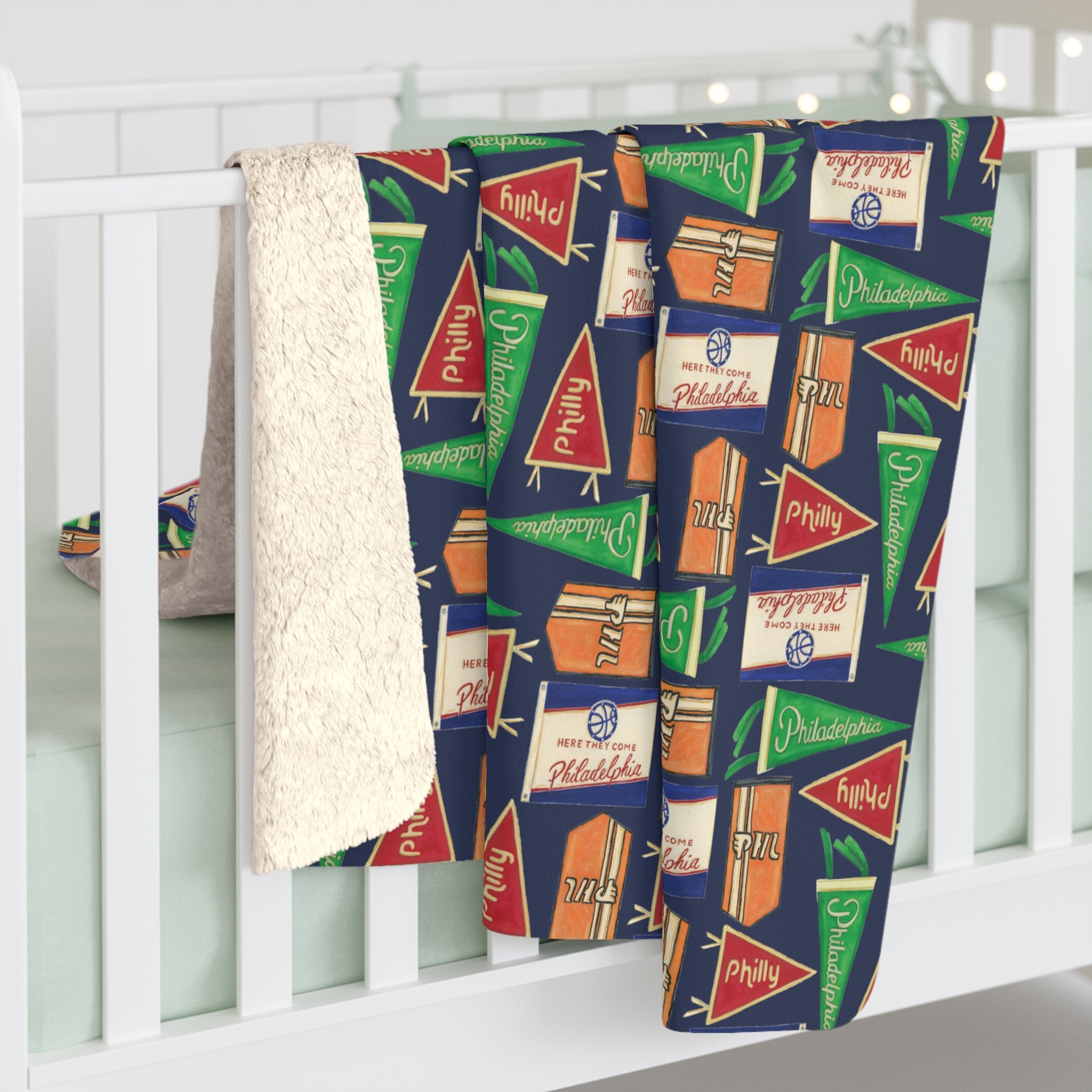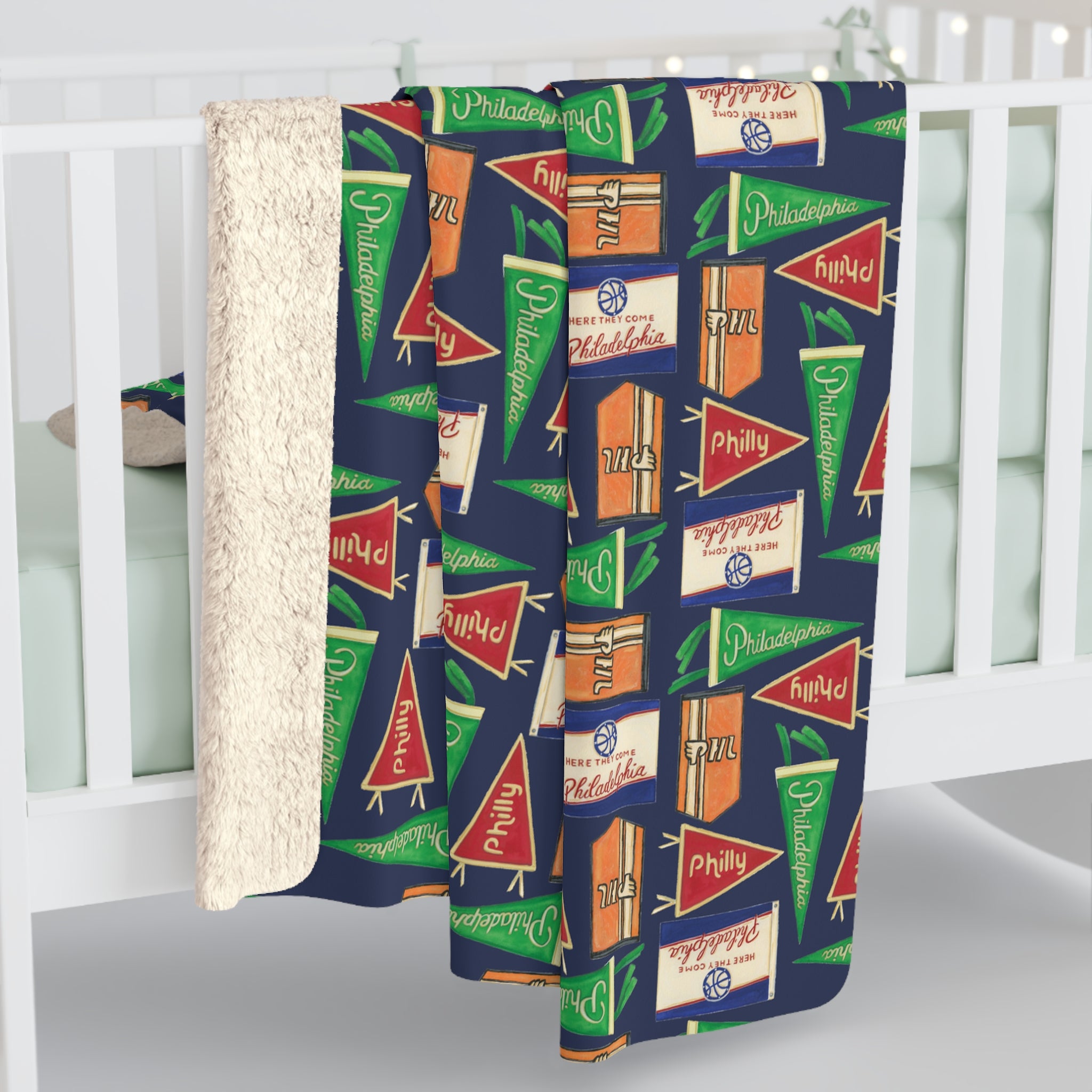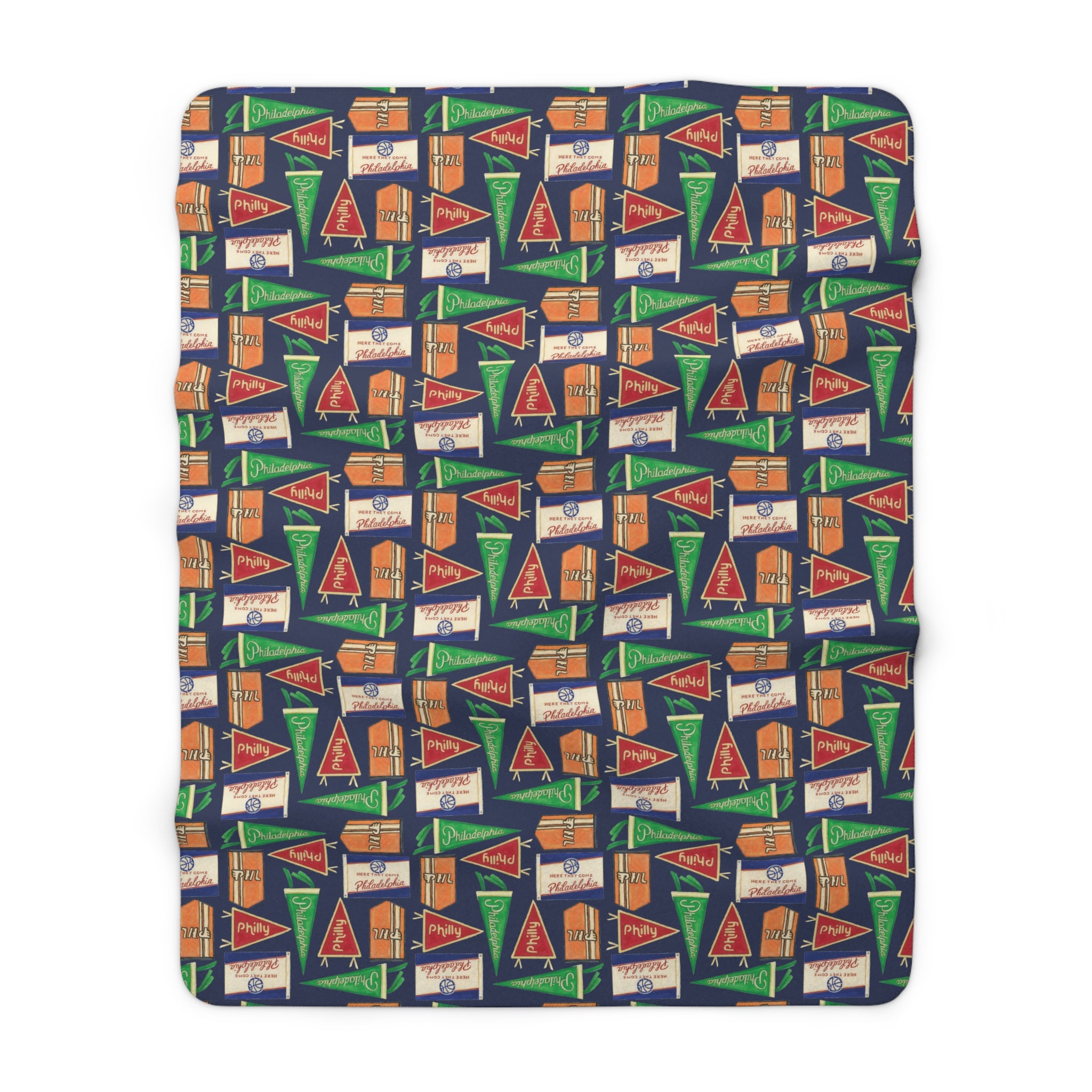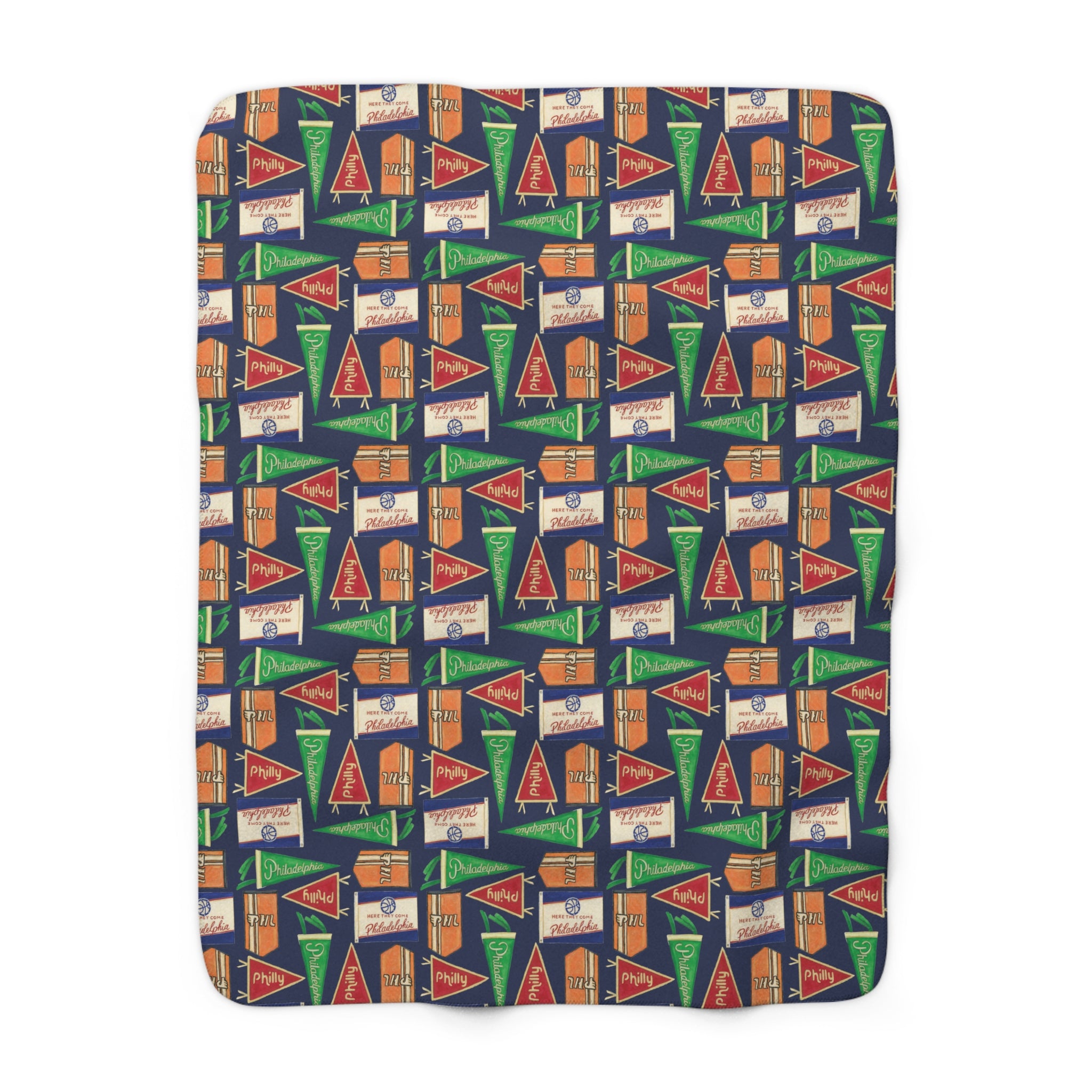 Unbelievably fluffy and warm - this high-quality cozy fleece blanket is impossible to leave behind wherever one might go. The perfect size for snuggling on the couch, by the fireplace, or at outdoor events. Get cozy with this throw blanket featuring original watercolor art by Emily Hendrie of "Philly Flags". Art is printed on the blanket.